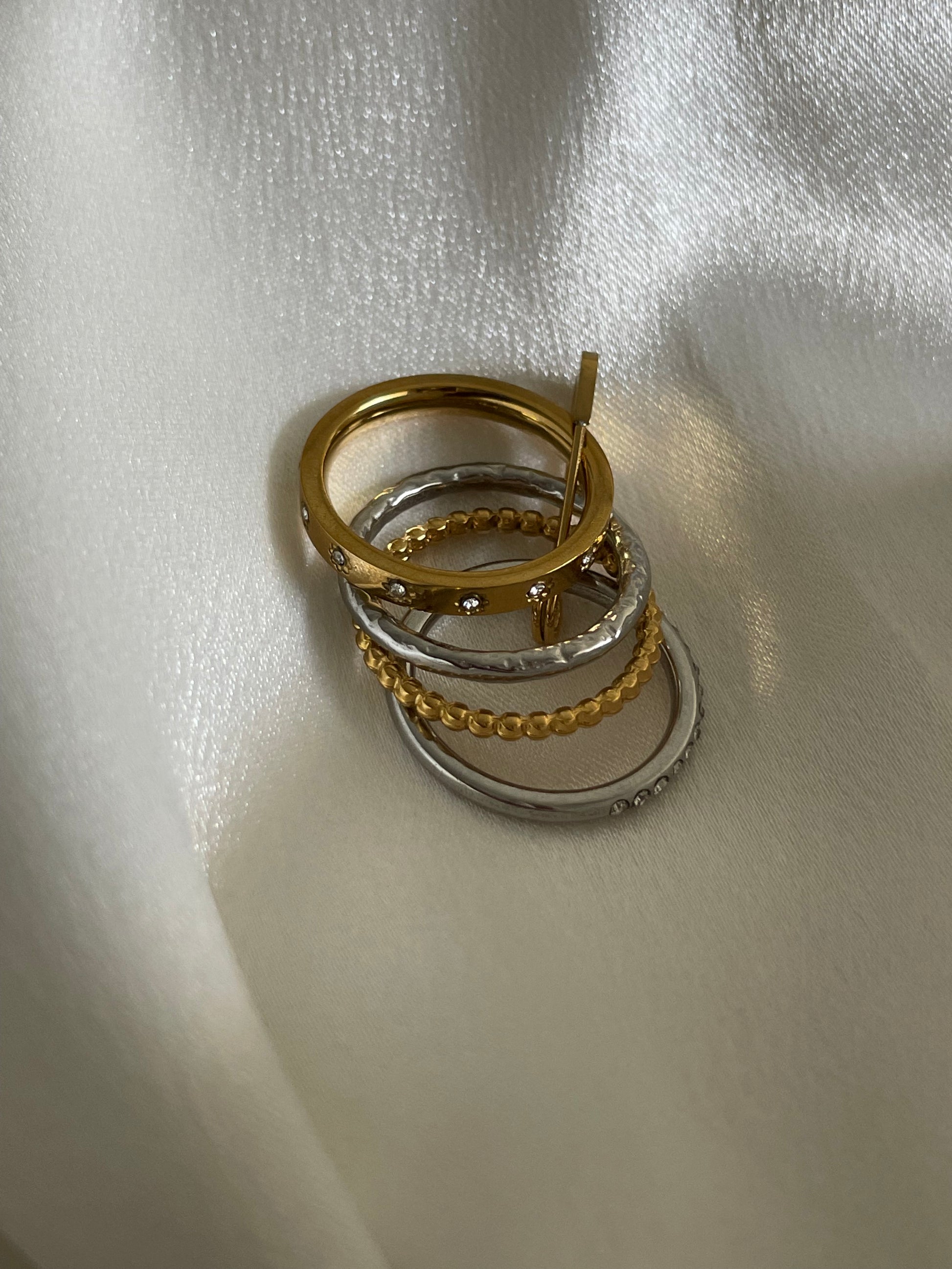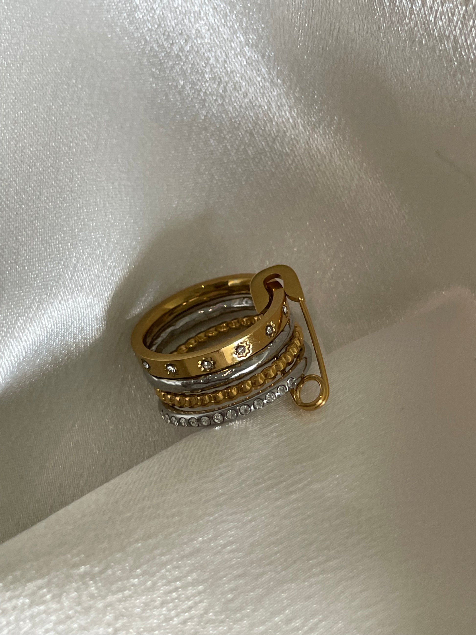 She’s glam, she’s the main character — she’s evrything. Featuring two-tone metalwork with a captivating twist design and sparkling gemstone accents, it's the kind of bold piece that transforms any look from ordinary to unforgettable. Stack it, wear it solo, or mix and match with your favorite rings for endless styling possibilities. This ultra-stacked ring with mixed bands says it all.