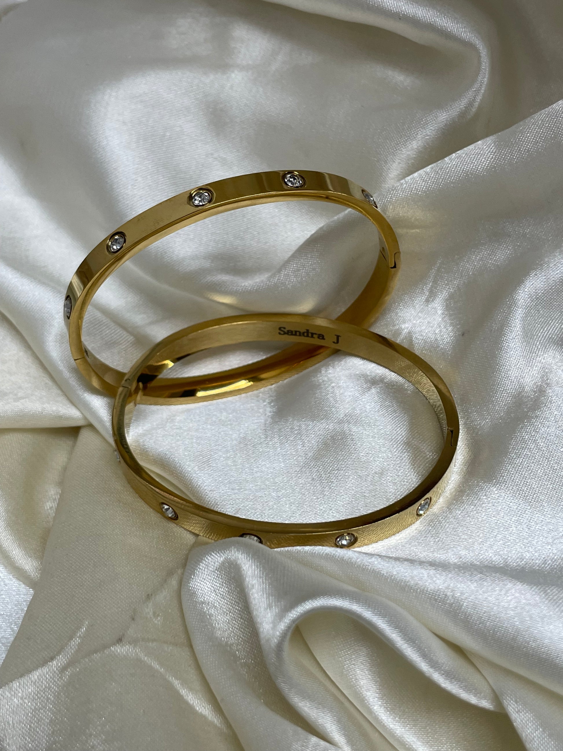 Add a personalized touch to your jewelry collection with Our Custom Engraved bangle. The love bracelet is crafted from premium stainless steel and includes 10 clear stones. It fits a wrist of 17cm or less in circumference