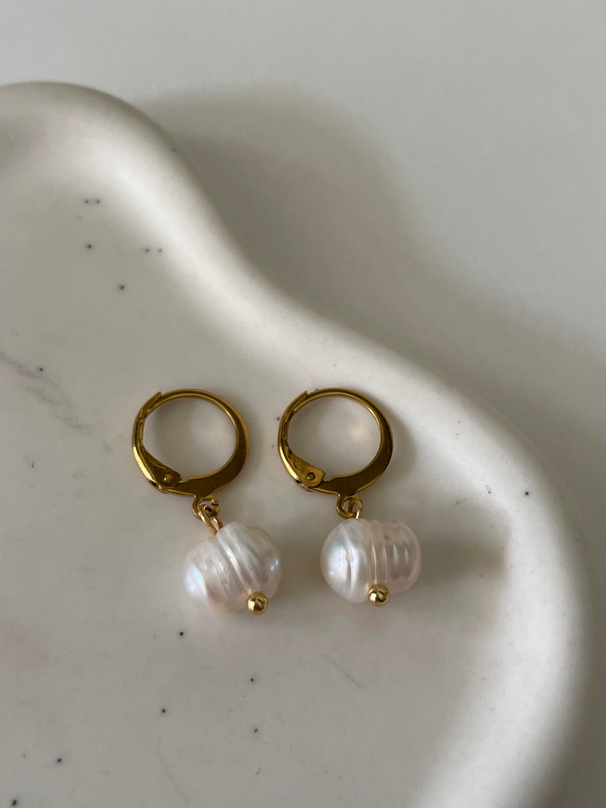 Everyday gold huggies earrings with a freshwater pearl drop.
